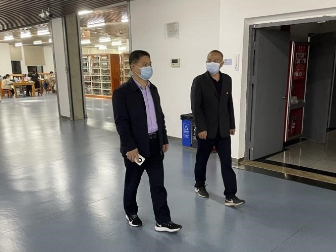 52日晚,校党委副书记蔡海生来到图书馆,检查指导“五一”期间图书馆疫情防控工作并慰问坚守在一线的工作人员,图书馆党支部书记彭齐东陪同。
