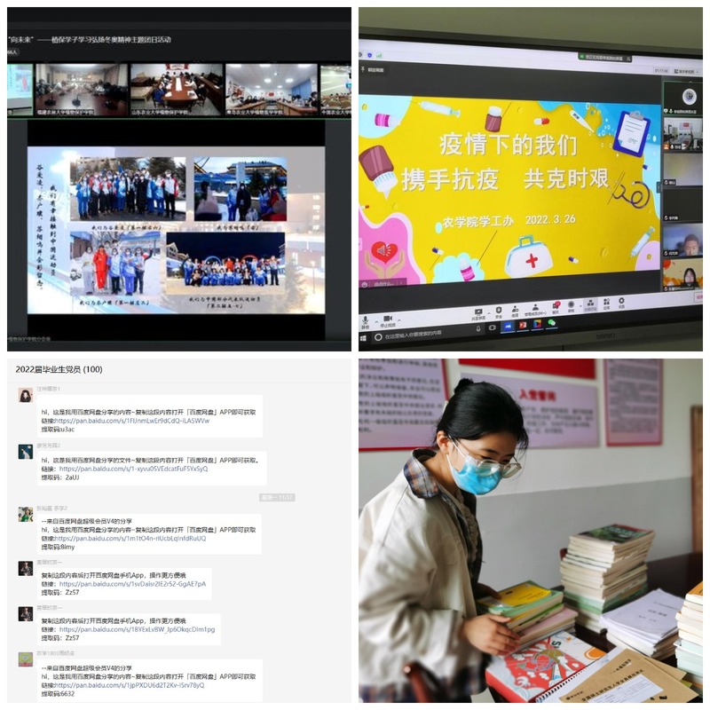 在防疫抗疫工作中,农学院充分发挥党团组织的核心引领作用,进一步筑牢疫情防控的思想防线。自学校封闭管理以来,学院先后两次组织学生干部、学生党员“再上一堂‘携手抗疫,共克时艰’”专题思政课,动员关键少数提高思想认识,发挥模范带头作用,带领全体同学维护校园安全稳定和学生身心健康,共同营造平安和谐、向上向善的学习、工作和生活环境。各班团支部累计开展抗疫精神传承、防疫知识学习和国家安全教育主题班会90余次。