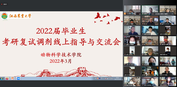 突如其来的疫情使学校转为闭环管理模式,给2022届毕业生考研复试带来巨大心理和实际压力,为助力2022届毕业生夺取考研“最后一公里”胜利,3月27日和28日动科院召开2场考研复试调剂线上指导与交流会,学院吴小波教授、宋德平副研究员主讲,院长胡国良、党委副书记陈小志分别主持,2022届考研学生、相关老师和领导参加会议,省委书记易炼红28日到校调研保就业保民生工作时指导会议。