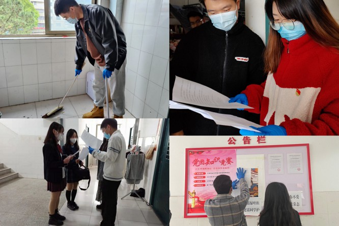 “消”公共区域。在楼道卫生清理好之后,园林与艺术学院研究生临时党支部的成员们随即戴上消毒手套,使用前期就已经调配好的消毒酒精对所有楼层进行病毒及细菌“消杀”,为宿舍楼架起一道安全屏障。