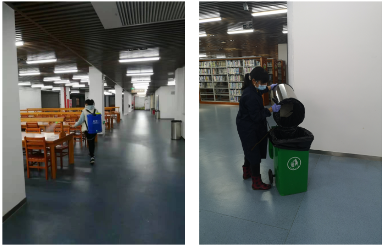 为给读者提供安全、舒适的学习环境,图书馆各部门分工合作、联防联控,共同落实防控措施,在入馆处设置“一米线”,严格落实佩戴口罩、测量体温、刷卡入馆,阅览室要求隔位就座,考研自修室采用单双号限入,严格控制入馆人数;启用图书馆消毒柜,每日进行清洁消杀工作并做好防疫消杀台账记录;对图书馆设备、门把手和电梯按钮、水龙头、洗手池等高频接触面和公共场所进行消杀;入馆处放置备用口罩,洗手间配备洗手液;加强垃圾分类管理,做到日产日清,每天闭馆后对垃圾桶进行消杀处理。同时,每天开馆时开窗换气,闭馆后启用新风系统换气,以保证馆舍的通风顺畅。图书馆通过微信公众号、学习委员群等告知图书馆疫情防控措施,以取得学生的理解和支持。