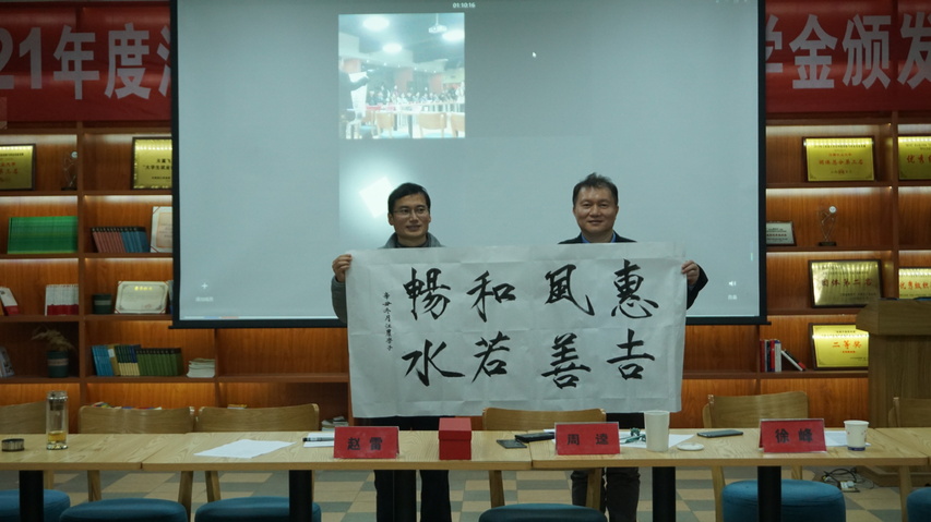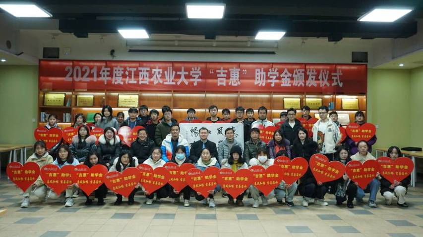 仪式上,周逵先生介绍了“吉惠”助学金设立的初衷与评定原则,宣读了2021年度bevictor伟德国际1946官网“吉惠”助学金受助名单。“吉惠”将结合学生实际情况,给予24位同学每人5000元资助,12位同学每人2500元资助。周逵先生通过亲笔书写明信片寄语受助学生,希望他们乐观积极、心有感怀、珍惜时光。在座谈交流环节,周逵先生现场视频连线其兄妹,与受助学生分享他们家庭成员在江农生活、学习成长和社会奋斗的经历和感悟,以及对江农的感情与情怀,并解答了同学们在学习、理想、生活等方面的困惑。