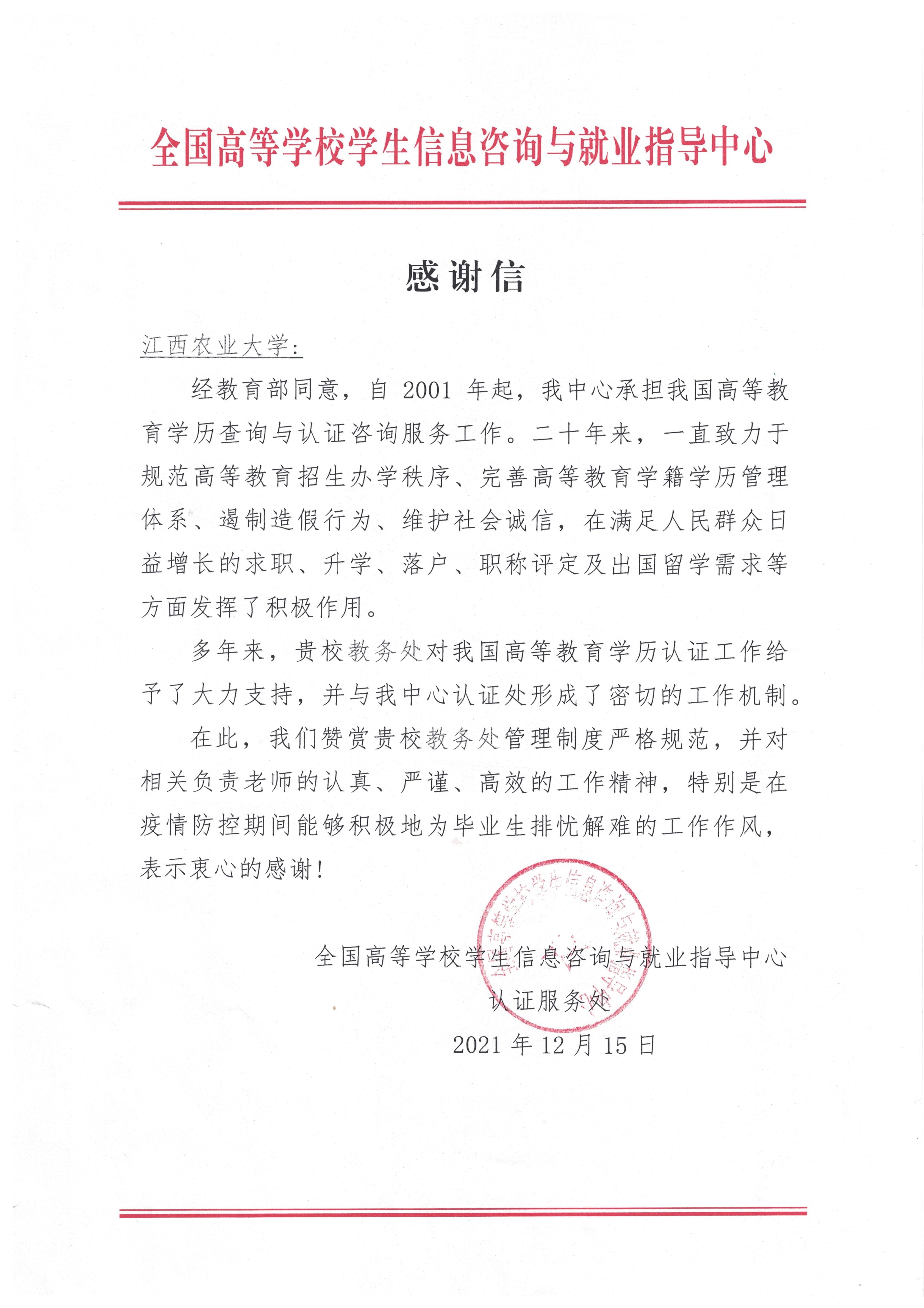 日前,伟德教务处收到教育部全国高等学校学生信息咨询与就业指导中心的一封感谢信,对伟德教务处认真严谨、高质高效地完成了教育部高等教育学历及成绩认证工作表示诚挚感谢。