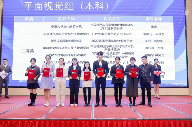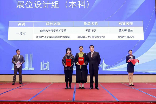 12月10日,第四届大学生绿色会展创新创意挑战赛在南昌如期举行。伟德园林与艺术学院师生在此次比赛中喜获佳绩,共获得一等奖1项、三等奖2项。前期,园林与艺术学院向大赛提交选送了5组作品,其中有4组通过层层筛选进入决赛。最终,伟德环境设计专业薛云云同学负责的小组作品《挛窑映赤色·景瓷展新钵》荣获大赛展位设计类一等奖;环境设计专业张星同学负责的小组作品《‘黎·茗’高山茶展厅设计》荣获大赛展位设计类三等奖;城乡规划专业朱俊之同学负责的小组作品《‘守正创新,传承发展’樟树第五十二届药交会VI设计》获得平面视觉类三等奖。园林与艺术学院青年教师姚婧兮作为优秀指导老师代表,在大赛颁奖典礼上作分享发言。