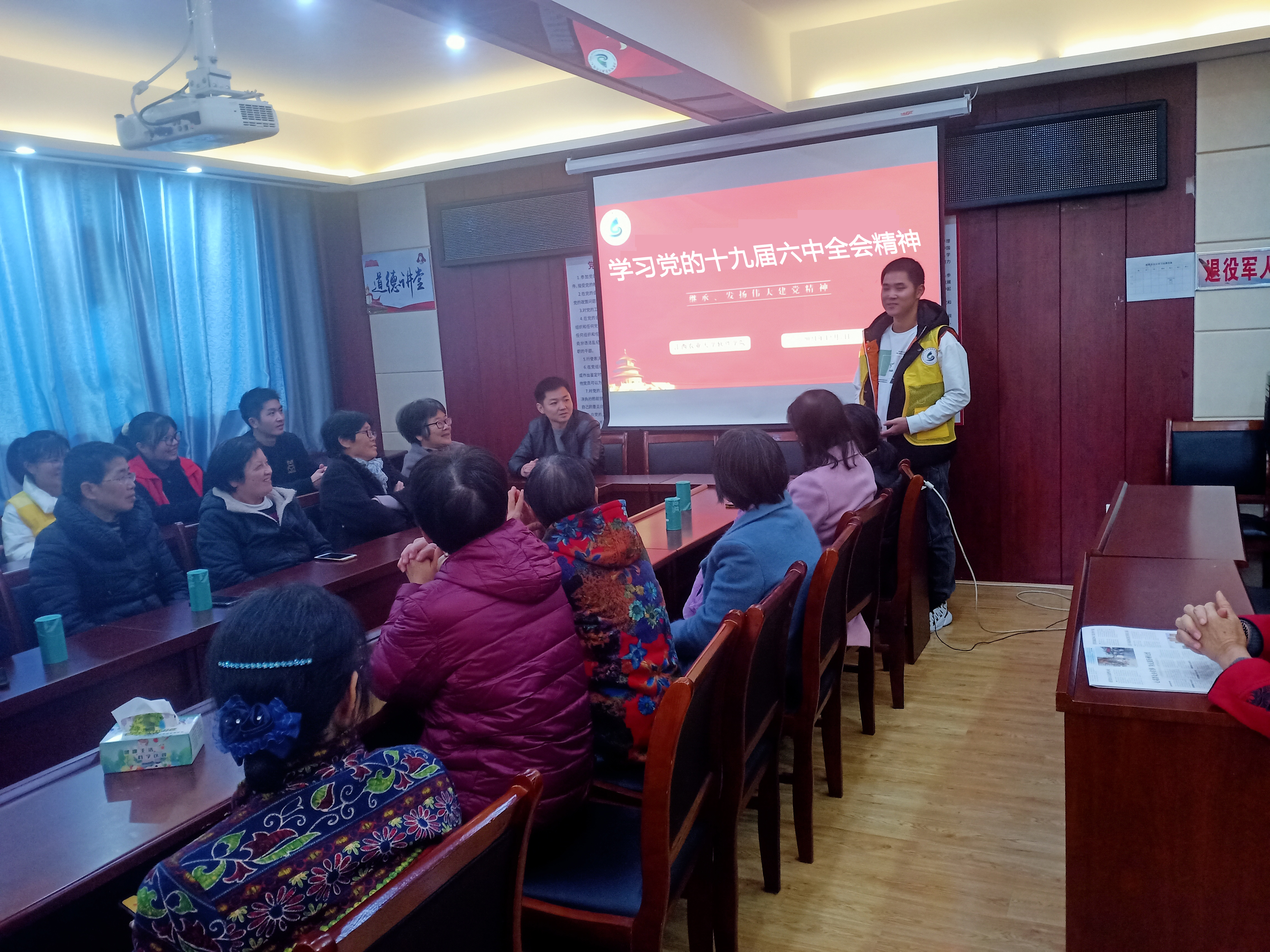 为深入学习贯彻党的十九届六中全会精神,软件学院组织部分学生党员、青年团员组成“大学生宣讲团”,深入南昌市丽景苑社区开展“理论宣讲进社区”志愿服务活动。活动期间,通过“理论宣讲+现场答疑”的方式,为社区居民带来了一场别开生面的党课,让党的声音深入百姓心中。