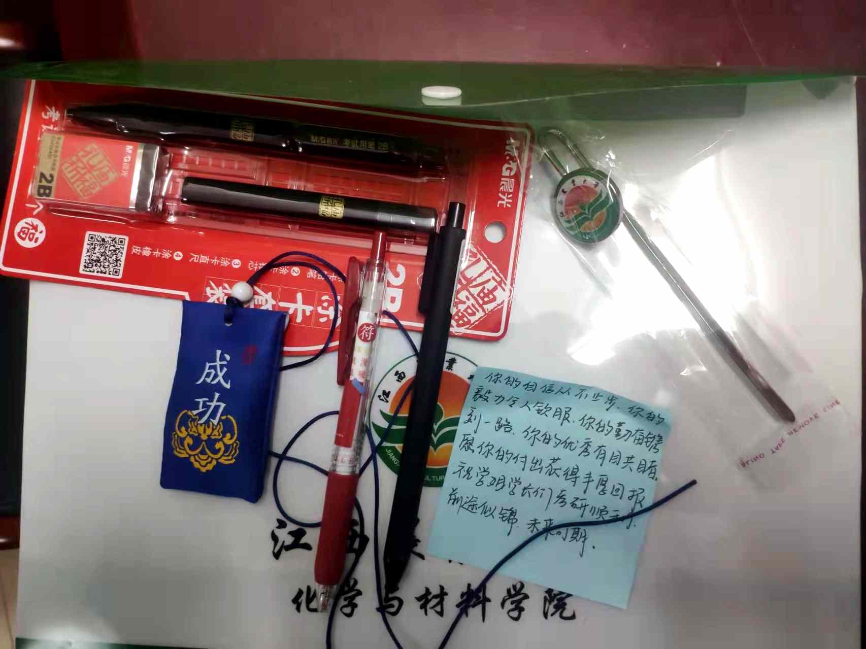 最后,全体老师为考研学生送上了精心准备的“考研大礼包”。考研学子纷纷表示,学院领导老师们的谆谆教诲和精心准备的礼物犹如锦囊妙计让自己在考研的“战役”中增添信心和底气,要更加努力拼搏,力争考出优异的成绩。