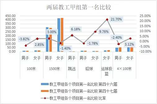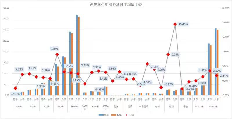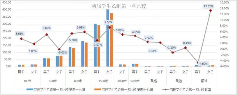 径赛有进步。在开设的学生甲组14个项目当中有12个项目单项冠军成绩超过了46届运动会单项冠军成绩,其中男子400米冠军成绩高于去年1.77秒,男子800米冠军成绩高于去年6秒,女子5000米冠军成绩高于去年22秒,男子10000米冠军成绩高于去年61秒;学生乙组10个项目单项冠军成绩均超过了46届运动会单项冠军成绩,其中男子100米冠军成绩高于去年1.6秒,男子400米冠军成绩高于去年2.8秒,女子800米冠军成绩高于去年10.4秒,女子1500米冠军成绩高于去年28.5秒,男子5000米冠军成绩高于去年52.3秒。