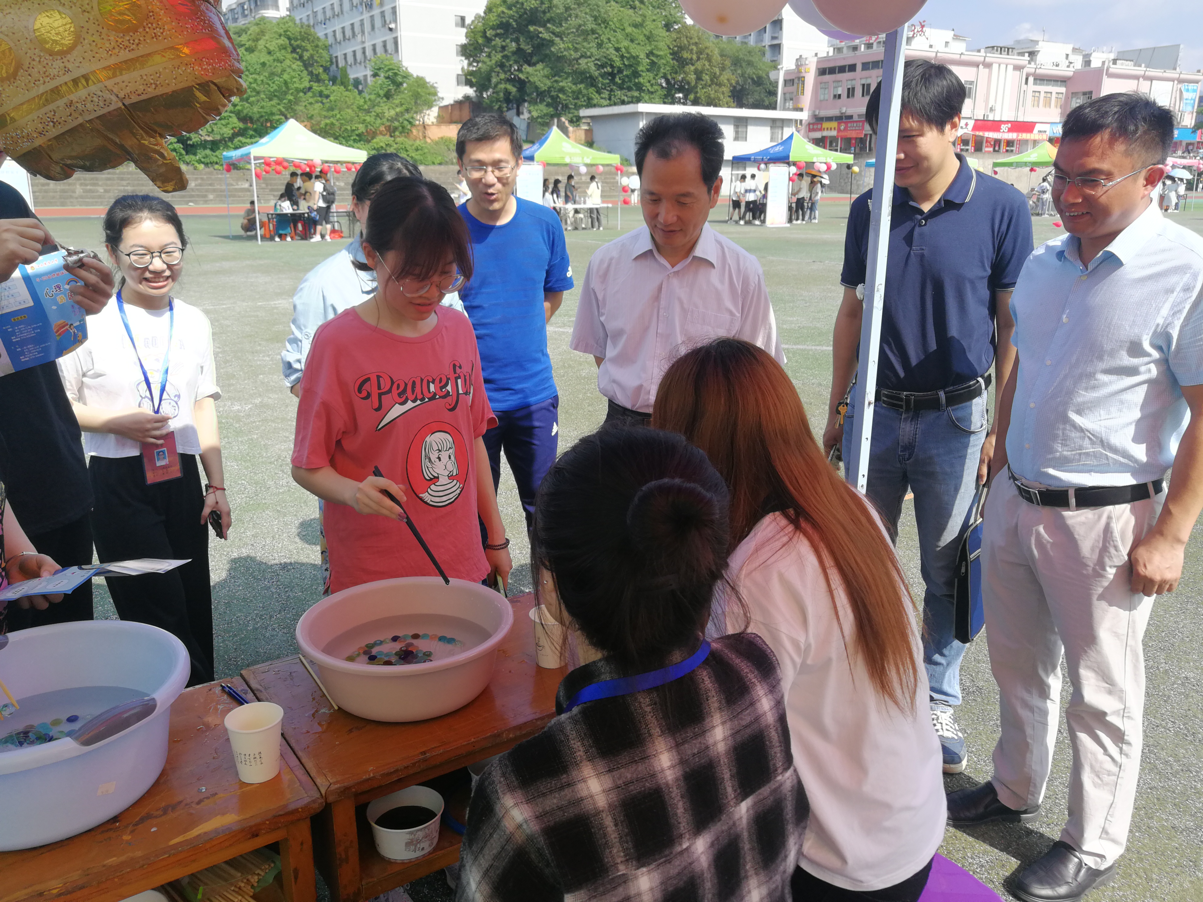 5月9号上午,由学工部(处)大学生心理健康咨询中心组织的心理游园会活动在南区田径场举行,副校长许斌华莅临现场指导,并与大学生们一起体验了部分游戏项目。活动吸引了近千名大学生到场参与。