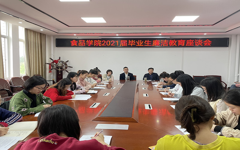 为扎实推进党史学习教育,食品院以廉洁建设为切入点,面向2021届毕业生开展廉洁教育。4月27日,毕业生廉洁教育座谈会在学院召开,这是毕业生在大学的“最后一堂思政课”,也是他们迈向社会的“第一堂廉洁课”。院党委书记范云、院长王文君、院党委副书记胡丹和毕业生代表参加了本次活动。