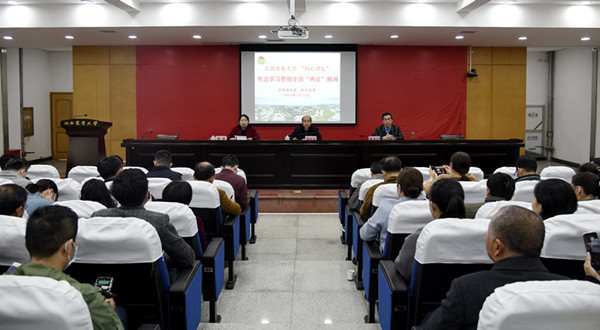 3月16日下午,学校举办“同心讲坛”学习会,全国人大代表、校民革委员会副主委、教务处处长魏洪义,全国政协委员、民建省委会副主委、副校长刘木华分别传达了全国两会精神。学习会由校党委统战部和机关党委共同主办,学校各民主党派和统战团体代表以及机关党员干部聆听了报告,经开区下罗派出所部分干警也参加了学习会。会议由校党委委员、统战部部长黎瑛主持。