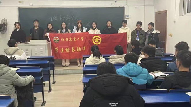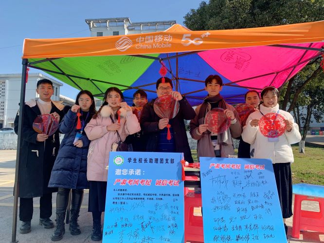 考试周前期,学生校长助理团支部来到计科2003班、资环2001班、环设2001班等6个新生班,开展“诚信考试,文明应考”宣讲活动。团支部成员详细向新生解读了一些关于考试的相关规定,鼓励大家好好学习、诚信应考。团支部还在北区食堂广场举办的“诚信考试·喜迎新年·祝福新年”活动,现场宣讲学风考风,开展诚信考试签名,得到广大同学的积极响应。