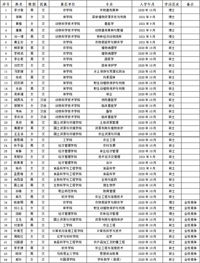 根据教育部、财政部《普通高等学校研究生国家奖学金评审办法》和江西省财政厅、江西省教育厅《江西省高等学校研究生国家奖学金暂行实施细则》、《bevictor伟德国际1946官网研究生奖学金实施办法》、《关于进一步做好伟德研究生奖学金评选工作的补充通知》及《关于预拨2022年普通高校国家资助经费的通知》等相关文件精神,伟德近期开展了2022年研究生国家奖学金评选工作,经研究生本人申请,各基层培养单位审核初评,校研究生奖学金评审领导小组评审,现将伟德2022年研究生国家奖学金获得者候选人公示如下:
