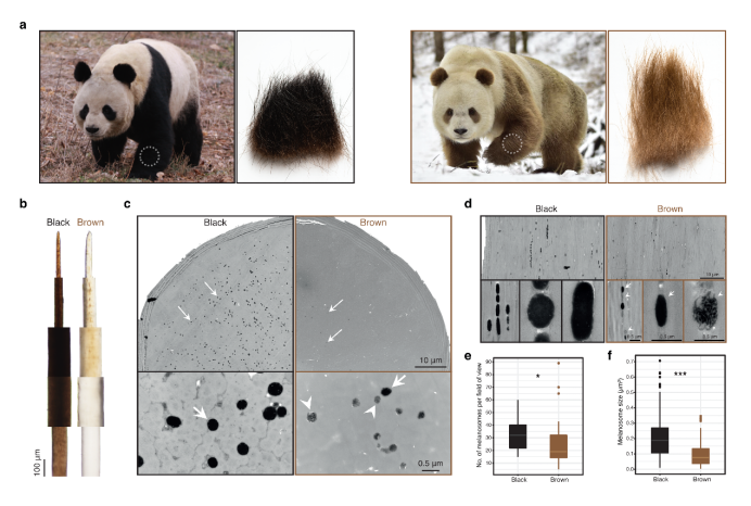 为探明大熊猫这种棕白毛色与黑白毛色的差异,研究团队首先对二者的黑色和棕色毛发分别进行了细致的显微和超显微结构观察。显微图像显示,棕色毛发内的色素含量明显少于黑色毛发。而横纵切面的透射电镜与统计结果进一步显示,大熊猫黑色毛发中富含着色均匀的黑素体(富集黑色素的细胞器),而棕色毛发中的黑素体数量和截面积都显著小于黑色毛发,且存在大量结构散乱的缺陷型黑素体。