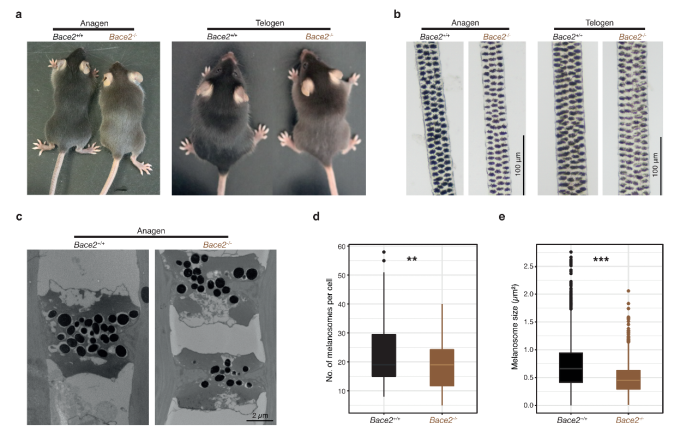 为验证大熊猫Bace2基因的25bp缺失对毛色表型的影响,研究人员使用CRISPR‒Cas9基因编辑技术在C57BL/6J品系小鼠中构建了同源区段敲除的小鼠模型,发现所有Bace2-/-小鼠的毛色浅于野生型毛色。显微观察发现,相较于1月龄生长期,4月龄休止期的小鼠毛发中色素缺乏的情况更为显著。对小鼠背部毛发进行透射电镜观察并统计单个细胞内的黑素体数量和截面积,Bace2-/-小鼠出现与棕色大熊猫相似的黑素体数量显著减少和截面积显著减小。综合以上所有信息,研究人员推断Bace2基因的25bp缺失最可能是导致大熊猫出现棕白色毛色变异的原因,这也是首次报道Bace2基因突变影响了野生动物的毛色变异。