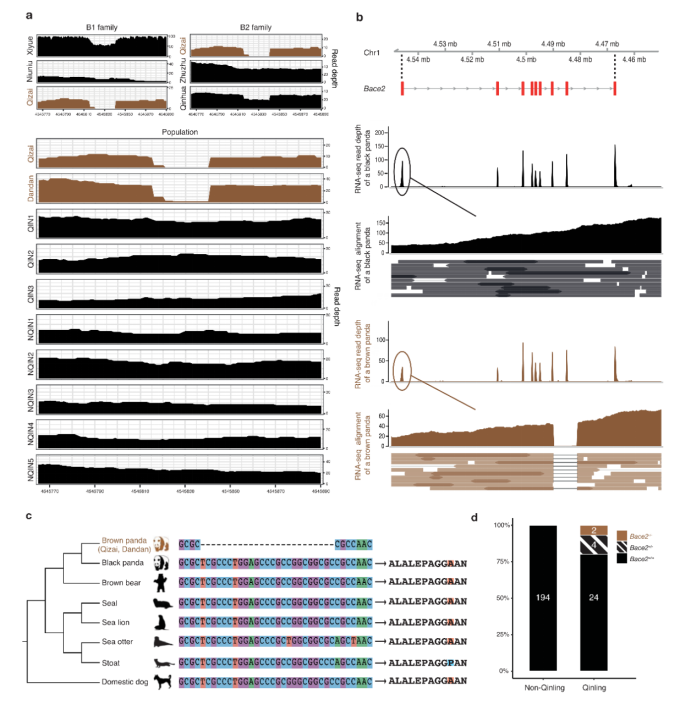为验证Bace2基因结构的完整性,以及25bp缺失是否在棕色大熊猫中真实存在,研究团队检查了所有重测序个体在该区段的测序深度,并利用转录组测序数据确认了Bace2基因结构的完整性,同时在RNA水平验证了该突变在棕色大熊猫中真实存在。为进一步探究该缺失突变与棕色变异关联的可靠性,研究团队对其它192只秦岭、非秦岭、或杂交的黑白大熊猫Bace2基因的该缺失变异区段进行PCR和Sanger测序,结合35只全基因组重测序个体共227只大熊猫个体,最终确认仅两只棕色大熊猫存在纯合25bp缺失,四只秦岭黑白色大熊猫和圈养大熊猫秦华为杂合子,而其它黑白色大熊猫均为野生型纯合子。