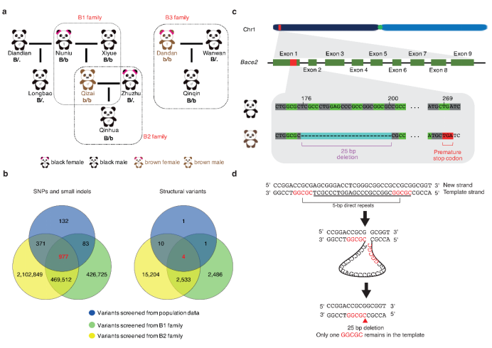 为揭示棕色大熊猫背后的遗传模式与分子机制,研究人员基于在佛坪保护区及其周边区域的157只大熊猫的微卫星基因分型数据及圈养繁育信息,构建出棕色大熊猫“七仔”的两个家系,发现七仔的父母及后代均为黑白毛色,结合七仔和已知的丹丹家系,推断该棕色表型是由常染色体隐性遗传模式控制。进一步,研究人员利用三代测序技术、Bionano、Hi-C等测序技术对七仔的父亲“喜悦”的基因组进行了从头组装,构建了其染色体水平的基因组。以该基因组作为参考,结合七仔、丹丹、七仔家系的四只黑色大熊猫以及其它秦岭和非秦岭地区的29只野生大熊猫,共35只熊猫个体的高深度重测序数据,研究人员在大熊猫常染色体上鉴定出了大量的SNPs、small indels和结构变异。经过种群和家系水平的变异筛选,棕色大熊猫位于1号染色体上Bace2基因第一个外显子上的25bp纯合缺失突变最可能是其毛色变异的遗传基础。