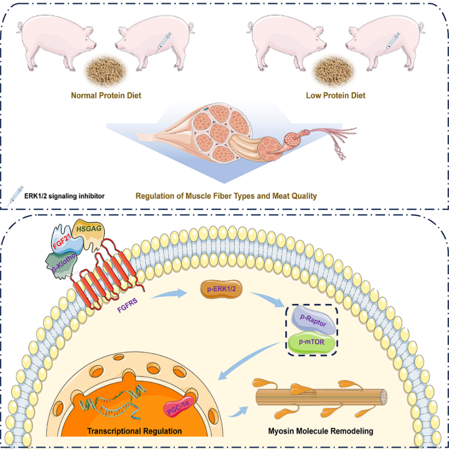 猪肉作为我国主要的肉类消费食品,是人们主要的动物蛋白质来源,但猪肉品质和消费者的预期仍有较大差距。采用低蛋白日粮技术不仅节约蛋白质饲料资源,还是生产优质猪肉产品、实现养猪业高效能的重要途径。因此,探索低蛋白日粮调节肌肉生物学特性的分子机制,特别是对机体内分泌信号介导的肌纤维发育和肌纤维类型转化机制研究十分重要,对科学制定低蛋白日粮的营养策略,推动猪肉品质精准调控具有重要的意义。研究团队采用分子生物学和肌肉代谢组学技术,以日粮蛋白限制的手段诱导仔猪机体FGF21的快速表达和分泌,并通过注射ERK1/2特异性抑制剂,探讨了FGF21作为内分泌信号影响猪肉质特性的分子机制。研究发现猪骨骼肌感知FGF21信号,通过激活ERK1/2,诱导mTORC1复合体中Raptor磷酸化,导致mTORC1信号通路活化,从而调控PGC-1α转录活性和骨骼肌代谢功能,促进慢速氧化性肌纤维生成。本研究结果明确了FGF21是介导低蛋白日粮促进猪氧化型肌纤维生成的关键内分泌信号之一,为动物生产上科学研发猪肉品质调控技术提供了理论支撑。