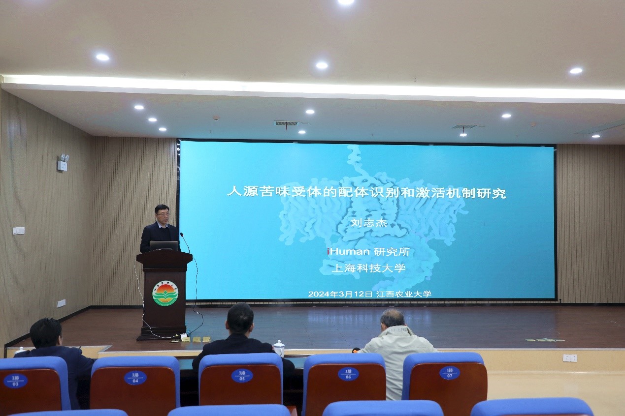 刘志杰教授以“人源苦味受体的配体识别和激活机制研究”为题,介绍了G蛋白偶联受体(GPCRs)结构生物学的研究进展、GPCRs作为细胞表面受体在机体发挥的作用、信号传导通路及对人类疾病研究,尤其是药物研发方面的重要作用,结合自身的研究成果及国际研究前沿分享了苦味受体的配体识别及激活机制。