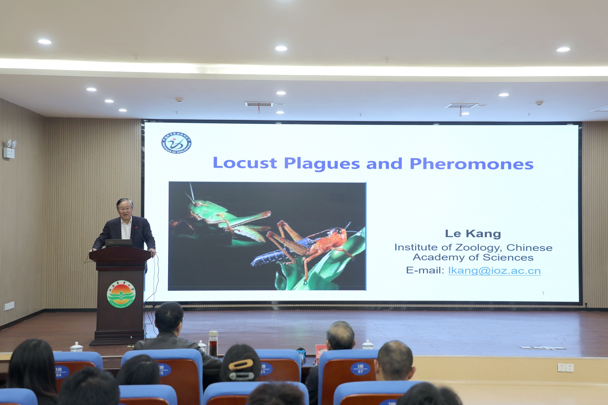 康乐以“蝗虫信息素与成灾机理”为题,结合自身研究经历从蝗虫、蝗灾及成灾机理的国内外研究进展、学术界当前认定的蝗虫PAN非聚集信息素而是用于阻止同类相食和抵御天敌和4-乙烯基苯甲醚(4VA)作为聚集信息素的分子机制等四个方面阐述了蝗虫信息素与成灾机理。