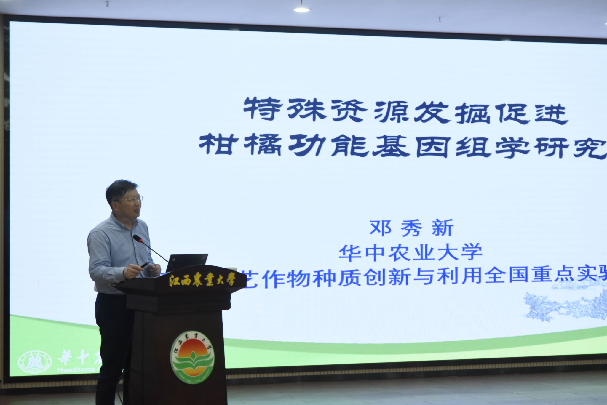 邓秀新以“特殊资源发掘促进柑橘功能基因组学”为题,系统阐述了特殊柑橘种质资源在功能基因组学研究中的关键作用。从“山金柑”搭建遗传转化平台,到“宗橙”开拓果色研究新路径,再到单性胚材料助力珠心胚机制探索、滑皮金柑解析油胞生长分子机制,每项研究工作都展现出独特视角与创新思维。