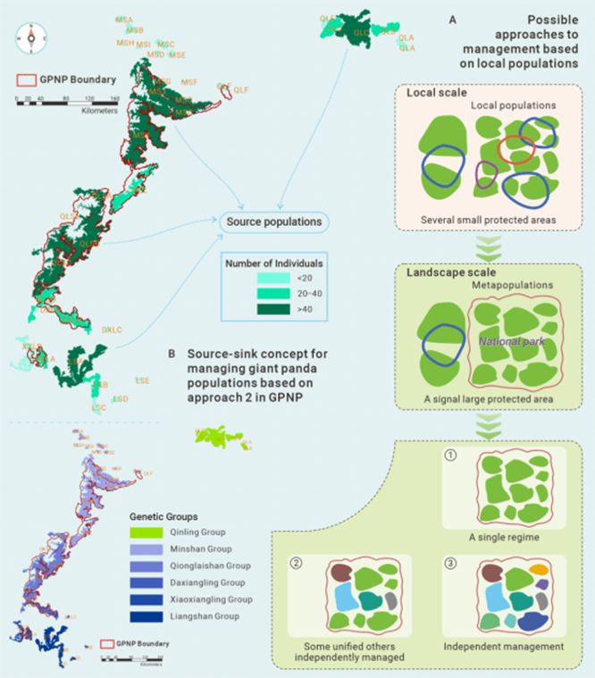 该研究进一步整合大熊猫(Ailuropoda melanoleuca)已有研究,探讨了上述三种管理模式。现有大熊猫种群被划分为33个局域种群。根据大熊猫不同区域的遗传多样性(秦岭与其他山系的遗传多样性差异大)以及大熊猫最小存活种群(大约在40只),建议将现有33个局域种群化为4个区域进行管理。这既能保证大熊猫野外种群的存活,又能保护遗传多样性,不同管理区域有一个核心种群和若干“卫星”种群,构成典型的“源-汇”种群。