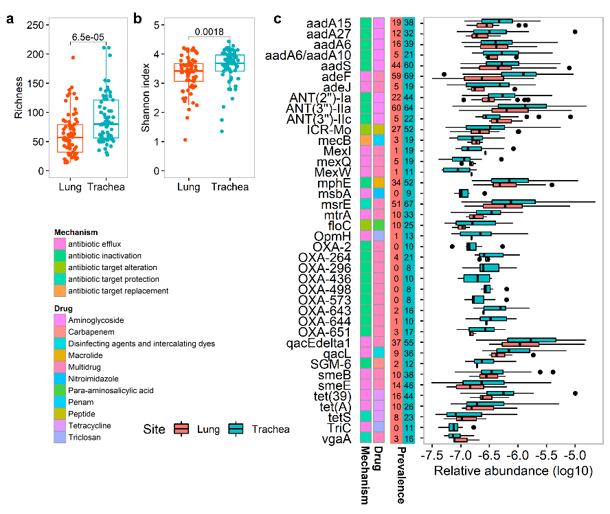 图:猪肺部和气管抗生素抗性基因组成比较