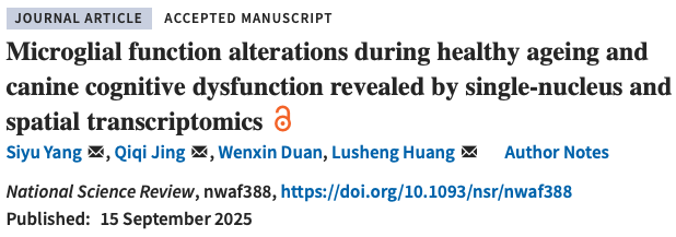 近日,bevictor伟德国际1946官网猪遗传改良与种质创新全国重点实验室黄路生院士团队在国际知名学术期刊《National Science Review》(五年影响因子17.7)发表了题为“Microglial function alterations during healthy ageing and canine cognitive dysfunction revealed by single-nucleus and spatial transcriptomics”的重要研究成果。该成果系统研究了健康衰老与老年痴呆认知障碍犬的脑细胞转录组,揭示了认知障碍犬中小胶质细胞C1QA与神经元CRT互作介导突触损伤的新机制。