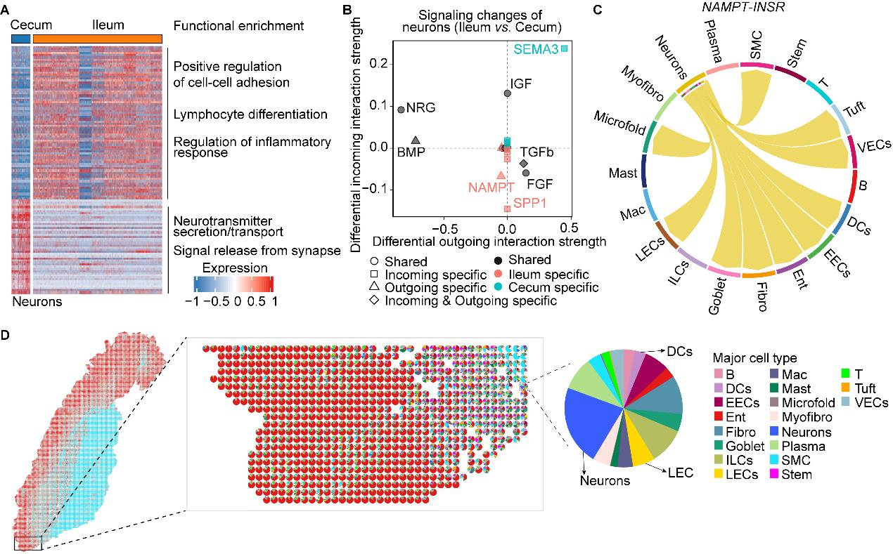 回肠和盲肠分别作为小肠和大肠的主要代表,研究发现,两者在细胞组成和基因表达上存在显著差异,其中回肠细胞免疫相关基因表达更高。回肠神经元高表达调控炎症反应的基因,显示其在炎症调控中的重要功能。进一步的细胞间通讯分析表明,回肠神经元通过NAMPT-INSR配体-受体对与树突状细胞和淋巴内皮细胞进行信号交流,从而调控炎症反应。空间转录组分析进一步验证了这些细胞间的相互作用,为深入理解小肠和大肠在免疫功能上的差异提供了新见解。