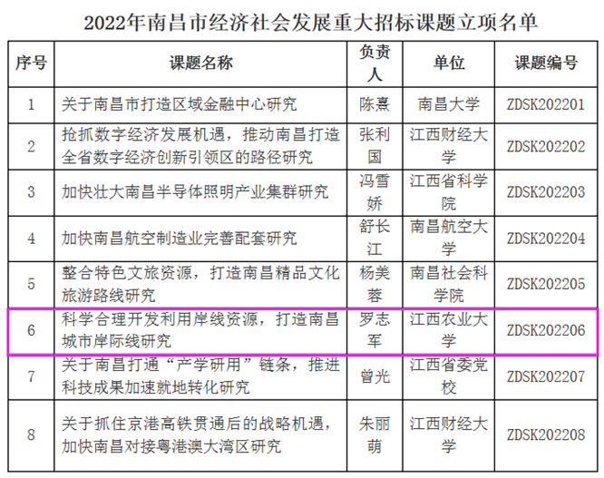 近日,2022年南昌市经济社会发展重大招标课题正式揭标,由伟德国土学院教授罗志军博士作为负责人申报的课题《科学合理开发利用岸线资源,打造南昌城市岸际线研究》,成功获批立项。