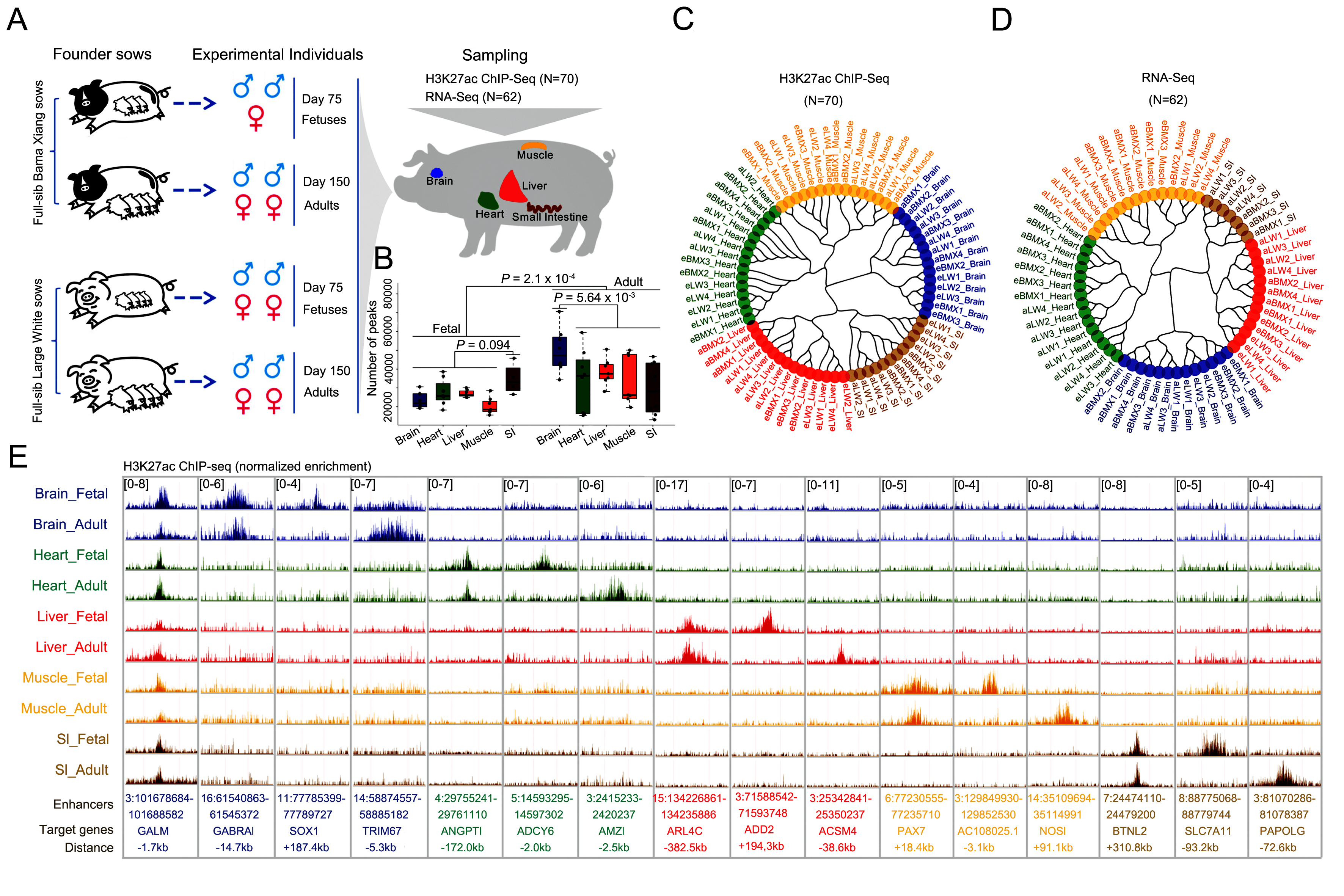 伟德猪遗传改良与养殖技术国家重点实验室黄路生院士团队在多时空多维度家猪启动子及增强子全基因组图谱构建的研究取得进展。研究团队利用H3K27ac ChIP-seq和RNA-seq等多组学技术系统地研究了来自不同发育胚层的多种组织(脑、肝、心脏、肌肉和小肠)、不同发育阶段(胚胎期75日龄和成年期150日龄)、不同品种(中国猪种巴马香和商业猪种大白)、不同性别(雌性和雄性)的101,290个活性增强子和启动子及其靶基因的功能及时空分布,揭示了这些调控序列在机体内发挥重要的生物学功能。鉴定到了110个在所有组织和发育阶段都稳定表达的安全港区域(safe harbours),为猪作为人类医学模型研究提供了有价值信息。发现 XIST基因启动子区域中的H3K27ac 和 DNA 甲基化可能与 X 染色体失活有关,丰富了人们对X染色体失活这一基础生物学过程背后基因表达调控的机制的了解。此外,团队在复杂性状相关基因以及突变位点的基因组区域中发现了相应的调控元件,为复杂性状的遗传解析提供了基础数据。相关研究成果以“Mapping and analysis of a spatiotemporal H3K27ac and gene expression spectrum in pigs”为题于2022年1月27日在Science China Life Sciences在线发表。黄路生院士、杨斌副研究员为文章的共同通讯作者,朱亚玲博士、周志敏博士、黄涛博士和张震博士为文章的共同第一作者。