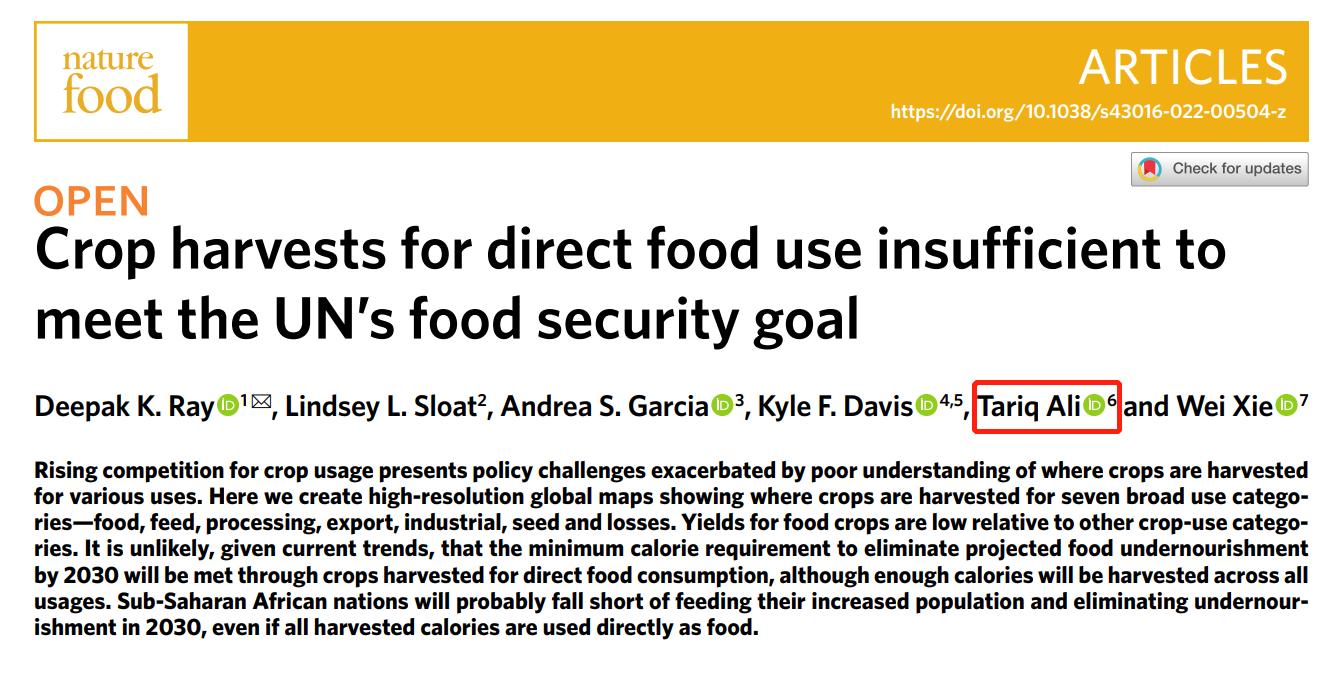 近日,经管学院Tariq Ali教授合作研究成果《Crop harvests for direct food use insufficient to meet the UN’s food security goal》在Nature子刊《Nature Food》上发表。美国明尼苏达大学环境研究院Deepak K. Ray教授为论文第一作者和唯一通讯作者。该研究绘制了七个最终用途的作物收成图,发现直接用于粮食的作物收成不足以满足联合国可持续发展目标,即到2030年保障人人享有粮食安全。