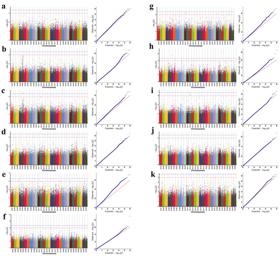 全基因组关联分析(GWAS)的曼哈顿图和QQ图。(a)花粉活力;(b)单花药花粉量;(c)单花花粉量;(d)单花雄蕊数;(e)单花花瓣数;(f)花冠直径;(g)花瓣花青素含量;(h)叶片抗坏血酸含量;(i)叶片总叶绿素含量;(j)叶片总酚含量;(k)叶片总类黄酮含量。蓝色虚线表示0.01水平显著,红色虚线表示0.05水平显著。