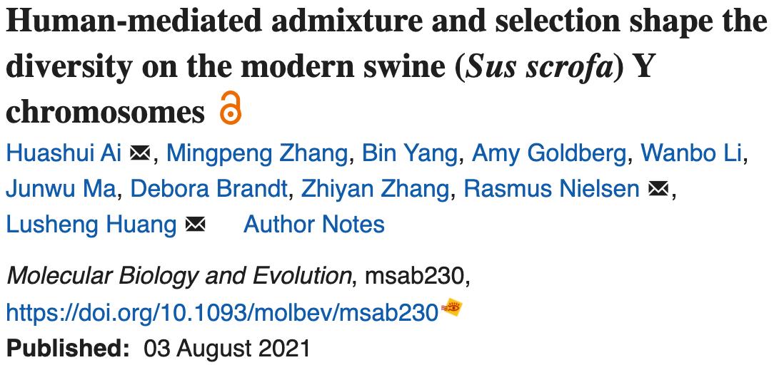 日前,伟德猪遗传改良与养殖技术国家重点实验室黄路生院士团队与加州大学伯克利分校等单位合作在《Molecular Biology and Evolution》(IF=16.24)发表题为“Human-mediated admixture and selection shape the diversity on the modern swine (Sus scrofa) Y chromosomes”的研究论文,系统阐述了人类介导的渗入和选择塑造现代家猪Y染色体的多样性以及从父系遗传角度揭示猪的演化历史。黄路生院士、学校首席教授艾华水研究员和加州大学伯克利分校Rasmus Nielsen教授作为共同通讯作者、2017级博士研究生张明鹏为共同第一作者,bevictor伟德国际1946官网作为第一通讯作者单位。