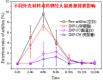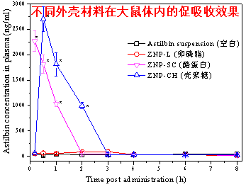 黄酮类物质是食品中重要的功能成分,有多种健康促进作用。但黄酮很难吸收,且在体内经I相和II相代谢可形成十余种代谢产物(如甲基化、葡萄糖醛酸化、硫酸化等)。复杂的代谢过程使得很难对ZNP促进黄酮体内吸收效果进行准确量化。课题组发现,由于特殊的鼠李糖结构,黄酮落新妇苷(龟苓膏中主要活性成分)在大鼠体内的代谢非常独特,几乎不发生转化而主要以本体的形式被吸收和血液输送。因此,落新妇苷是一种很好的模式黄酮用于定量不同口服给药载体的体内促吸收效果。在此基础上,课题组分别以卵磷脂、壳聚糖和酪蛋白为外壳材料,设计了三种不同的负载落新妇苷的ZNP,研究外壳材料对ZNP体内外性质的影响。结果表明三种壳材料都可显著增加ZNP体外稳定性,但体内促吸收效果差异巨大。壳聚糖、酪蛋白和卵磷脂促进落新妇苷体内吸收倍数分别为18.2,9.3和1.89倍。其主要机制为壳聚糖和酪蛋白具有肠道黏附性能,可以显著减少和推迟粪便对药物的排泄;而卵磷脂没有该性能。壳聚糖因为带有正电荷,与带负电的黏液蛋白结合能力比酪蛋白更强;但壳聚糖作为壳材料很容易使ZNP粒径过度增大,弱化渗透黏液层能力,从而减弱体内促吸收效果。