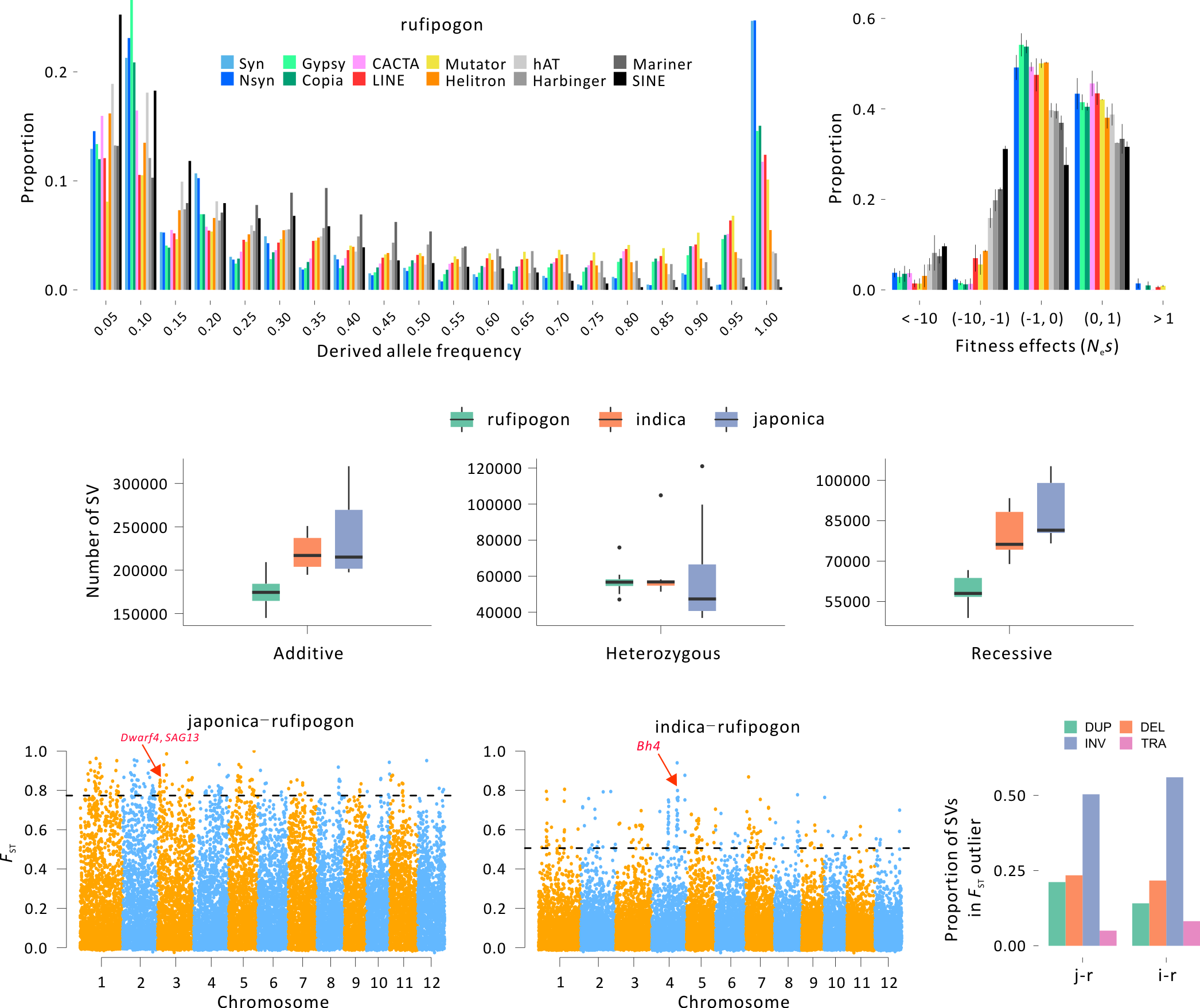 结构变异作为基因组变异的重要组成部分,对植物表型变异产生了巨大的影响,并在生产实践中得到了广泛的应用,然而从群体基因组水平上深度揭示其变化规律的研究甚少。该文以亚洲栽培稻Oryza sativa与其野生祖先种O. rufipogon为研究对象,基于基因组重测序数据(347份材料),以及三代和组装基因组数据,鉴定了水稻群体基因组水平上的结构变异,包括倒位、重复、删除、易位,以及转座元件;通过位点频谱变化规律和遗传负荷分析,揭示结构变异作用于水稻的驯化成本(domestication cost),并主要以有害突变的形式存在,尤其是倒位和转座元件SINE和mariner家族;此外,通过比较基因组分析发现,在水稻驯化过程中通过结构变异获得和丢失数百个基因,在一些显著分化的结构变异中还富集了一批与重要的农艺性状相关的基因。该研究不仅对水稻遗传育种具有重要的指导意义,同时也为植物驯化相关的研究,以及植物群体进化基因组学研究提供新的研究思路。