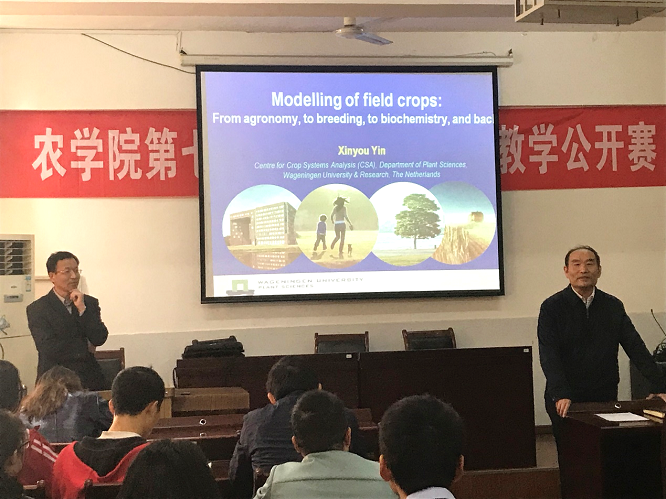 刘勇院长首先对殷新佑教授回母校进行学术交流表示热烈的欢迎,并简要地介绍了殷新佑教授的情况。在报告中,殷新佑教授首先介绍了瓦赫宁根大学及自己实验室的情况;然后结合自己在作物生态与耕作制度、作物经济模型、作物生长模型方面的研究成果,就自己建立的Gecros模型的构成、Gecros模型在QTL定位上的应用、将C3作物改造成C4作物的可行性、智能作物管理模型等方面作了详细的讲解。报告结束后,师生们就Gecros模型在作物抗倒伏、病虫害防御等方面的应用情况进行提问,殷新佑教授一一详细进行解答。刘勇院长在报告结束后要求在座的师生向殷新佑教授学习,并建议以后加强学术交流。殷新佑教授教授的报告深入浅出,大大地开拓了大家的眼界,让师生们受益匪浅。