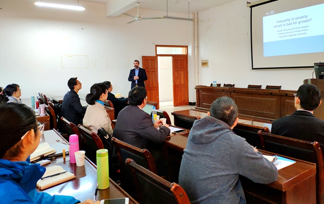 11月12日,澳大利亚税收和转型政策研究中心主任、澳大利亚国立大学教授Robert Breuning应邀来伟德进行学术访问,并为广大师生作了题为《Inequality, poverty and economic growth》的学术报告。副校长黄季焜会见Robert Breuning教授,来自北京大学中国农业政策研究中心和江西农大经管院近百位师生聆听了学术报告。报告会由经济管理学院副院长胡凯教授主持。