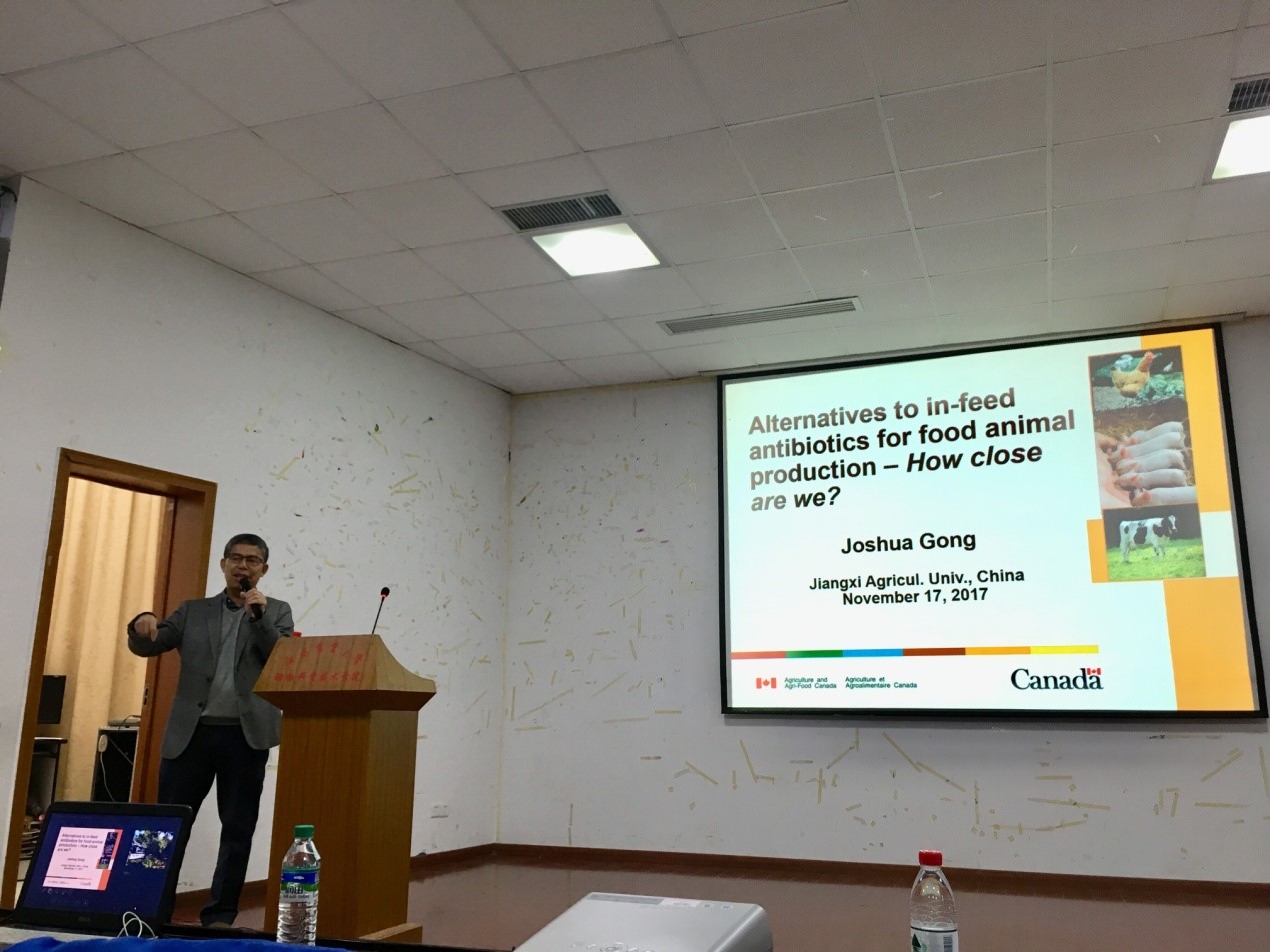 Johua Gong教授以《Alternatives to in-feed antibiotics for food animal production — How close are we》为题,简要介绍了他们实验室关于减少饲料抗生素应用所开展的研究工作,主要从动物肠道的微生态环境、致病菌类别、产品开发及产品作用机理四个方面进行探讨。随后,Johua Gong教授主要分析了几种精油对抗生素替代的功效,并从营养代谢和消化道微生物生态效应来探讨精油作为抗生素替代物的作用机理,以及运用精油包被技术提高精油的作用效果。