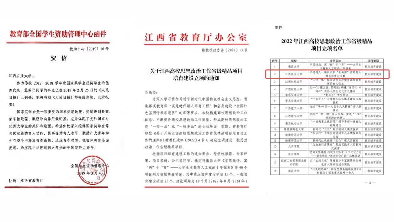 学校不断完善国家资助、学校奖助、社会捐助、学生自助“四位一体”经济资助体系,每年资助学生的奖助学金、国家助学贷款、勤工助学、临时困难补助等项目资金达1.2亿元,覆盖学生1.6万余人次,确保每一位家庭经济困难学生都能安心就读。率先在全省高校出台《国家奖助学金评定和资金发放工作“十不准”》,为资助工作定底线、划红线。构建了“学校统筹、学院负责、班为主体、全员参与”的学生资助工作体制机制。成立全省首个学生资助管理委员会,聘请近100名学生资助专员下班监察。建成全省首个资助信息管理系统,将资助项目线下步骤转化为资助工作线上流程,资助过程公开透明。 将“资无不言”畅谈坊常态化,每月定期与受助学生面对面交流,了解学生“急难愁盼”。2021年,在“发展教育脱贫一批”典型案例征集活动中,《脱贫路上的“江农”答卷》被教育部收录。《立德树人、强农兴农“金扁担”资助育人模式探索与实践》项目获批江西省高校思想政治工作省级精品项目重点培育建设项目,后期资助育人工作研究与成果总结获全国学生资助官网、学习强国等平台报道。2023年,在江西省学生资助规范管理典型案例和受助学生成长成才典型事迹征集活动中,获一等奖1项,二等奖3项。在江西省开展的四届“筑梦飞翔.资助伴我成长”主题活动中,学校连续四届均获得优秀组织奖。