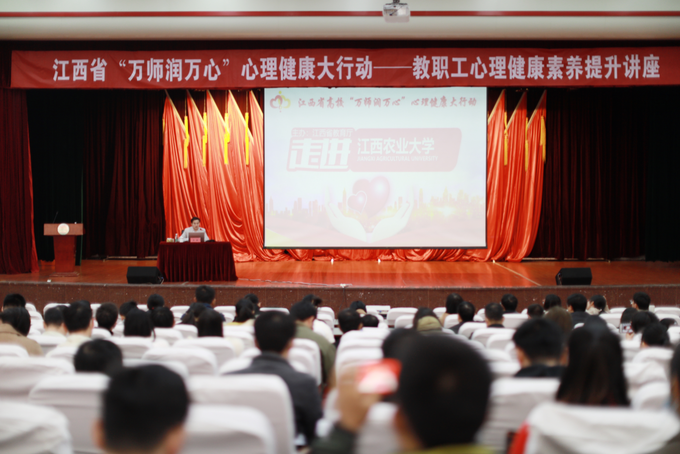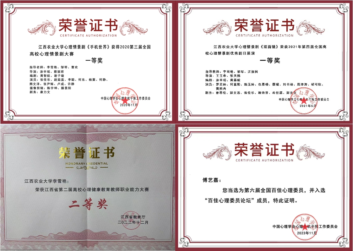 学校坚持“普查”与“排查”相结合,依靠“校、院、班、寝”四级心理工作体系,掌握学生心理动态。定期组织专兼职心理工作人员参加业务技能培训、校内外研讨会等。组织开展“千师润万心”心理健康大行动活动、开设学生心理骨干专业技能培训班,队伍水平不断增强,1人获评全国“优秀心理委员”称号,大学生心理健康协会入选全国高校心理健康社团。1人获评省高校大学生心理健康教育先进个人,2人荣获省专业能力大赛奖项。同时,获全国、省级高校思想政治工作优秀案例、论文奖2项、全国高校心理委员工作研讨会优秀论文奖1项。积极开展校园心理情景剧大赛、5·25心理健康月、心理素质提升训练营等品牌活动,共荣获全国高校心理情景剧大赛一等奖2项,三等奖1项,优秀剧目奖2项,百佳剧目奖2项,百佳心理微电影2项,荣获江西省心理情景剧大赛一等奖1项、二等奖1项,学校还受邀参加央视节目录制。