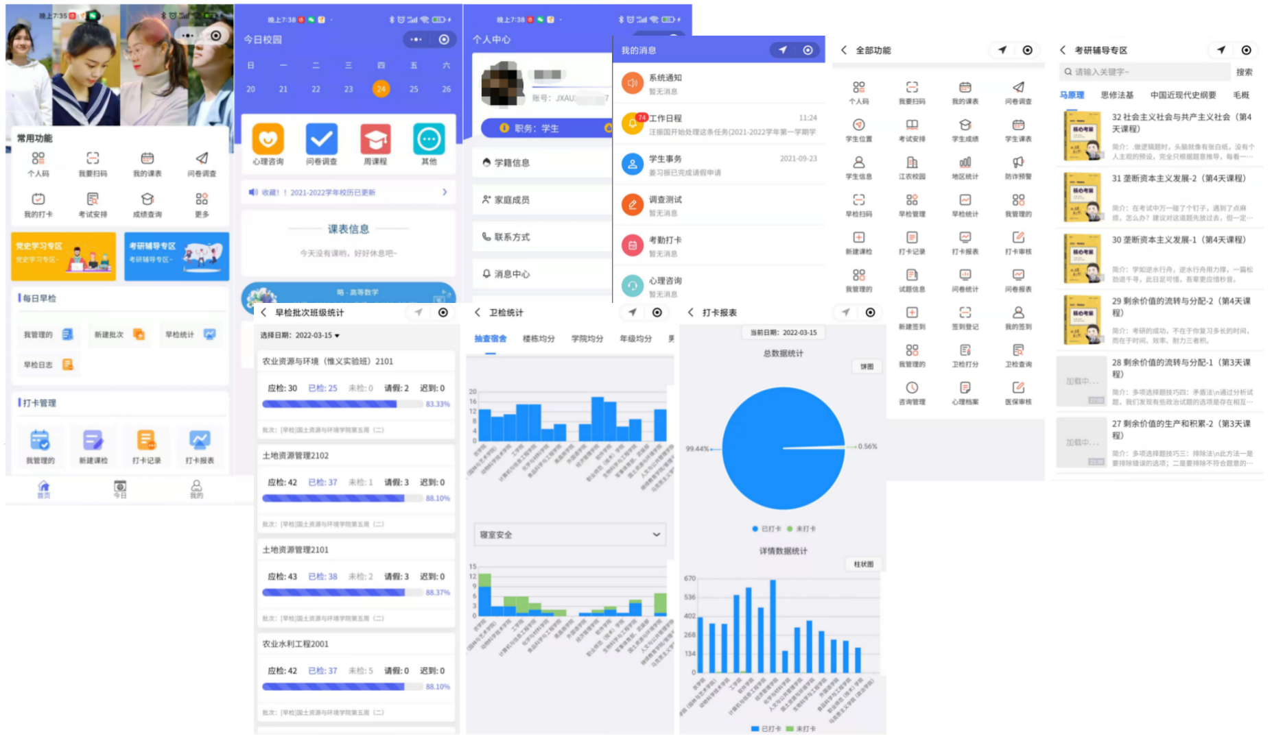 学校高度重视智慧学工建设,不断推动学生管理服务提档升级。在疫情防控期间,上线“江农智慧学工”微信小程序,增强学生管理工作精度,精准排查了密接、次密接及风险地区返校人员。依托智慧学工大数据后台,全校学生累计完成核酸检测打卡2192308人次,在智慧赋能的坚实支撑下,学校在国务院出台疫情防控十条之前,校内未发生一例新冠感染病例。