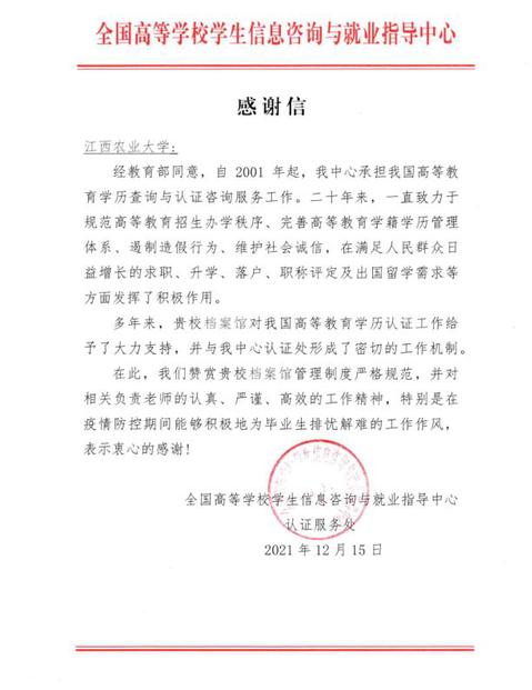 满足师生校友的档案利用需求为根本出发点,不断提升师生校友的查档体验借助互联网技术推动档案服务提质增效,“让数据多跑路、群众少跑腿”成为档案利用服务的新常态。新冠肺炎疫情防控期间,档案馆开通预约查档、远程查档、代查档案服务,解决广大师生校友急难愁盼问题,实现了档案利用者足不出户在线申请查阅学籍档案的目标,工作得到广泛好评。与此同时,为广大教职工职称评审、房产公证等关乎切身利益的民生问题,提供优质高效服务。在学校重大活动中发挥档案资政作用,档案馆先后省委巡视、专项审计、学历核查、人事档案专审、三家村搬迁、老旧小区改造、土地房产清查、省一流学科第三方绩效评价等专项工作提供档案查阅,发挥档案不可替代的凭证作用。五年来,档案馆共提供线上线下档案利用服务15100余人次,提供档案查借阅16648卷。因出色完成相关工作任务,2021年学校收到教育部全国高等学校信息咨询与就业指导中心的感谢信,2022年度学校获评江西省档案馆馆藏到期文书档案开放复核先进单位。