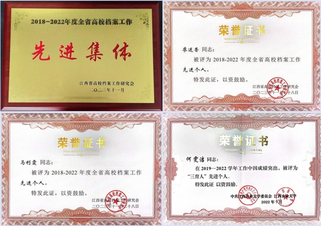 档案馆党支部始终坚持以习近平新时代中国特色社会主义思想为指导,全面贯彻党的二十大精神和习近平总书记考察江西重要讲话精神,始终坚持“档案工作姓党”的第一原则,旗帜鲜明加强政治引领。聚焦“兰台匠心”金扁担党建品牌建设,“党建+档建”为基本思路,立足部门职能特点,将党建工作与档案业务、服务育人有机融合、有序推进,服务学校事业发展、解决师生校友急难愁盼,围绕落实立德树人根本任务,建设成为档案资政、服务育人的基层党组织,充分发挥支部战斗堡垒和党员先锋模范作用,推动党建引领档案事业高质量发展。2021年,档案馆党支部年终考核为“五星党支部”。2022年,何雯洁荣获学校“三育人”先进个人称号。2023年,档案馆荣获“全省高校档案工作先进集体”称号,廖述香、马利霞荣获“全省高校档案工作先进个人”称号。