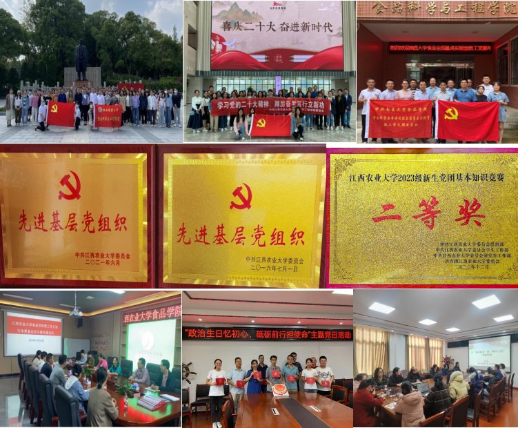 坚持党建引领,推进融合发展。学院党委切实履行管党治党主体责任,全面贯彻新时代党的建设总要求,深入开展“不忘初心、牢记使命”、党史学习教育和学习贯彻习近平新时代中国特色社会主义思想主题教育。以党建“三化”建设为抓手,促进党建工作与中心工作深度融合,打造具有学院特色的“金扁担”党建品牌“红焙筑梦推动党建与学科发展、人才培养、学风建设深度融合学院“双带头人”担任教工党支部书记比例达100%建立完善学院党委班子成员、党支部支委联系普通党员、党员联系群众“双联系”制度,及时掌握师生动态,着力解决师生的“急难愁盼”;通过基层党支部志愿服务活动开展科技服务,学院党员教师每年进行科技服务不低于50人次,为江西地方经济发展贡献力量,基层党组织的战斗堡垒作用发挥更明显,党员先锋模范作用发挥更突出。学院先后荣获先进基层党组织、校新生党团知识基本知识竞赛一等奖等成绩。