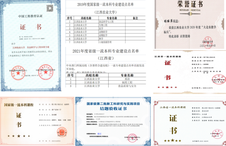 发挥特色优势,建设一流专业学院积极响应新工科建设理念,致力于培养食品行业的卓越人才专业建设取得了长足的发展,先后承担省级以上教学研究课题30余项、校级教学研究项目60余项,连续获得教育部首批与第二批新工科建设项目;获校级以上教学成果奖12项;《畜产品加工学》遴选为第二批国家级线上线下混合式一流本科课程《果蔬贮藏加工学》、《食品分析与检测技术》、《食品工程原理》、《食品生物化学》和《食品微生物学》等课程遴选为省级一流本科课程;江西特色优质稻米质量安全控制、山茶油油脂精炼虚拟仿真实验教学项目被认定为省级虚拟仿真实验教学项目。2022年农产品加工及贮藏工程教学团队遴选为省级高水平本科教学团队,江西省农产品贮藏加工工程实验教学示范中心顺利通考核;专业建设了校内粮油食品加工实训基地、畜产品加工实训基地、水产品加工实训基地,并与南昌双汇食品有限公司、益海嘉里(南昌)粮油食品有限公司等20余家单位和企业共建了实习基地,夯实人才培养平台。食品科学与工程专业先后遴选为江西省“十三五”和“十四五”一流特色专业,2019年入选国家级一流本科专业建设点,2022年通过国际工程教育专业认证,成为全校首个顺利通过工程教育专业认证的专业。食品质量与安全专业2021年入选省级一流本科专业建设点。专业高质量发展为本科教学质量提升、教书育人奠定了坚实的基础。