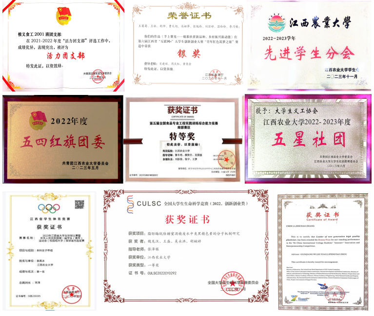 服务学生成长强化立德树人。学院以党建带团建,加强红色文化学习教育,弘扬主旋律,提升学生爱党、爱国、爱校热情,涌现了江西省三好学生、江西省高校毕业生基层就业典型、江西省大学生年度人物、“江农之星”大学生年度人物等学生先进典型。学院连续5年入围全校新生党团基本知识竞赛决赛,多次荣获校“五四红旗团委”称号,惟义食工2001团支部以第三名的成绩荣获2022年度江西省高校“活力团支部”最具组织力称号,入选全国高校“活力团支部”最具组织力TOP100榜。注重实践育人,依托挂靠学院团委的义工协会积极开展大学生志愿服务活动,荣获南昌市“先进慈善义工组织”、江西农大“最美志愿服务组织”、江西农大“五星级社团”等称号。真组织大学生志愿者开展“三下乡”社会实践活动,多次荣获省、校级“三下乡”优秀营队和优秀个人荣誉,得到中国文明网、人民网、中国江西网、江西志愿服务网、赣青团学等媒体的广泛报道。学院重视大学生创新创业工作,师生团队荣获全国食品专业工程实践训练综合能力竞赛南部赛区特等奖1项,一等奖1项、全国大学生生命科学竞赛一等奖1项,三等奖1项,“互联网+”大学生创新创业大赛中获国奖1项、省奖2项,“挑战杯”江西省大学生课外学术科技作品竞赛铜奖1项。