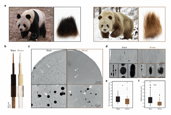 为探明大熊猫这种棕白毛色与黑白毛色的差异,研究团队首先对二者的黑色和棕色毛发分别进行了细致的显微和超显微结构观察。显微图像显示,棕色毛发内的色素含量明显少于黑色毛发。而横纵切面的透射电镜与统计结果进一步显示,大熊猫黑色毛发中富含着色均匀的黑素体(富集黑色素的细胞器),而棕色毛发中的黑素体数量和截面积都显著小于黑色毛发,且存在大量结构散乱的缺陷型黑素体