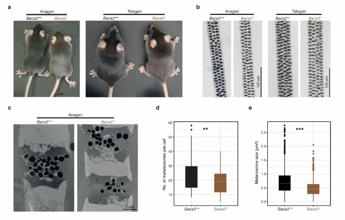 为验证大熊猫Bace2基因的25bp缺失对毛色表型的影响,研究人员使用CRISPR‒Cas9基因编辑技术在C57BL/6J品系小鼠中构建了同源区段敲除的小鼠模型,发现所有Bace2-/-小鼠的毛色浅于野生型毛色。显微观察发现,相较于1月龄生长期,4月龄休止期的小鼠毛发中色素缺乏的情况更为显著。对小鼠背部毛发进行透射电镜观察并统计单个细胞内的黑素体数量和截面积,Bace2-/-小鼠出现与棕色大熊猫相似的黑素体数量显著减少和截面积显著减小。综合以上所有信息,研究人员推断Bace2基因的25bp缺失最可能是导致大熊猫出现棕白色毛色变异的原因,这也是首次报道Bace2基因突变影响了野生动物的毛色变异