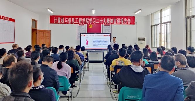 11月1日下午,校党委副书记蔡海生到计信学院宣讲党的二十大精神,计信学院全体教职工及部分学生党员、学生代表100余人在现场聆听,入党积极分子和大一新生约500人线上参加。