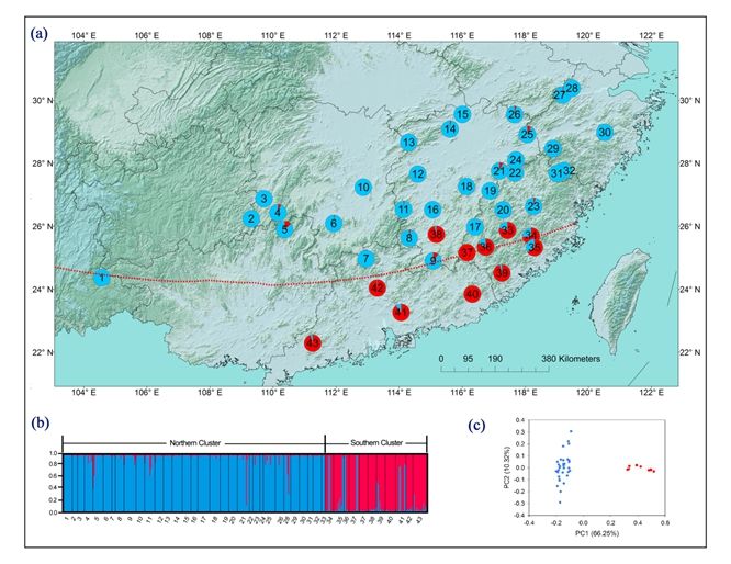 亚热带常绿阔叶林为我国南方代表性植被类型,对我国南方地区的生态安全维护和经济发展具有极其重要的意义。长期以来,关于我国亚热带和热带森林的边界在何处,一直是学界关注的焦点。近年来,伟德亚热带生物多样性实验室选取亚热带常绿阔林代表植物红楠Machilus thunbergii为研究对象,通过广泛的居群取样,发现在中国东南部北纬24°~26°之间,存在一条与植物冰点温度相关的生物地理分界线,这条分界线与一些气候学者划定的热带/亚热带分界线相吻合。在分界线两侧,红楠发生了显著的遗传分化。由于我国南方与亚洲热带广泛连接,热带植物有大量机会越过冰点温度线进入亚热带(暖温带),使得我国温带植物多样性远远高于北美和欧洲。该研究成果为理解我国亚热带植物区系的形成提供了一个全新的视角,也为我国南方森林植被分区提供了重要佐证。